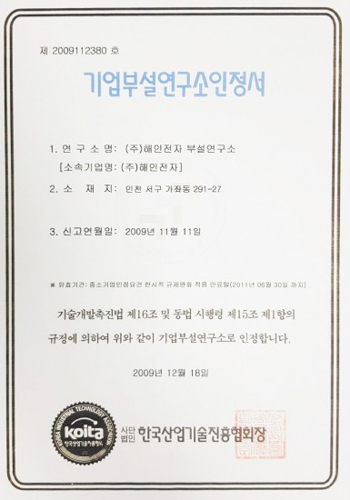 기업부설연구소인정서