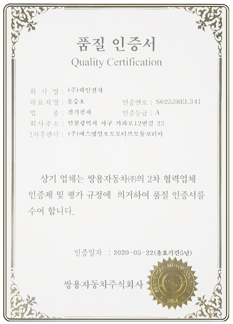 SSQ 인증서 페이지 정보 작성자 해인전자 댓글 0건 조회 433회 작성일 21-06-29 12:10 목록 본문 SSQ 인증서 이전글SQ 인증서 21.06.29 다음글IATF 16949 인증서 21.06.29 댓글 0 댓글목록 등록된 댓글이 없습니다.